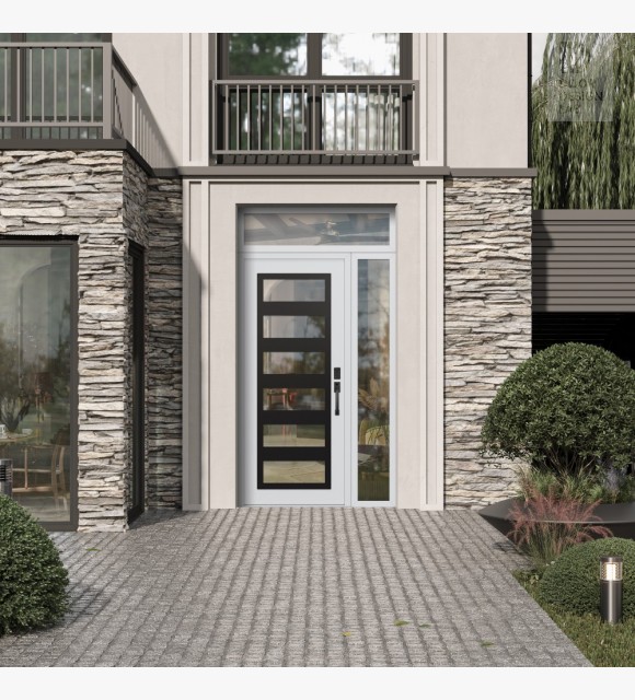 Modern Steel Front Door Diamond C9 50" x 96" white/white clear Glass Panel black LHI with Sidelite and Transom clear Glass