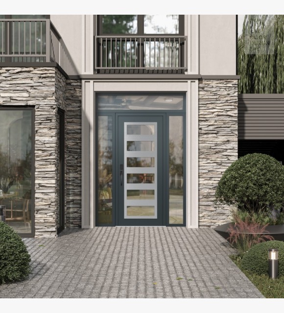 Modern Steel Front Door Diamond C9 64" x 96" anthracite/anthracite clear Glass Panel stainless steel RHI with 2 Sidelites and Transom clear Glass