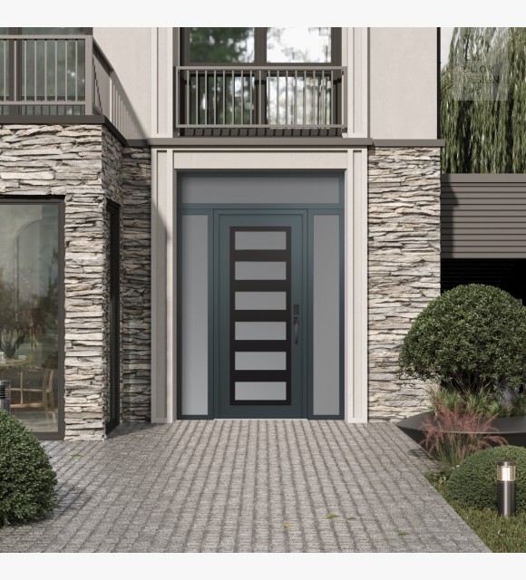 Modern Steel Front Door Diamond C9 64" x 96" anthracite/anthracite frosted Glass Panel black LHI with 2 Sidelites and Transom frosted Glass