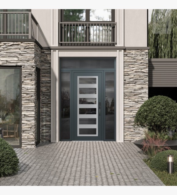 Modern Steel Front Door Diamond C9 64" x 96" anthracite/anthracite mirrored Glass Panel stainless steel LHI with 2 Sidelites and Transom mirrored Glass