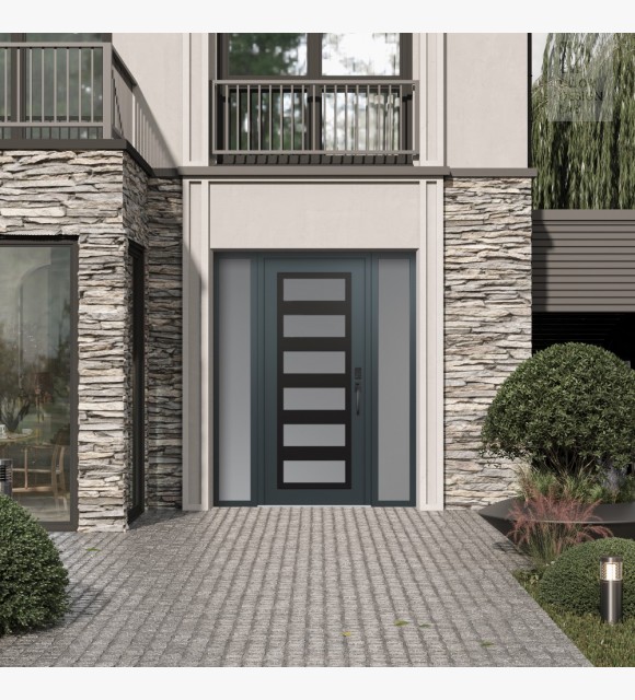 Modern Steel Front Door Diamond C9 68" x 80" anthracite/anthracite frosted Glass Panel black LHI with 2 Sidelites frosted Glass