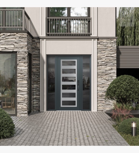 Modern Steel Front Door Diamond C9 68" x 80" anthracite/anthracite mirrored Glass Panel stainless steel LHI with 2 Sidelites mirrored Glass