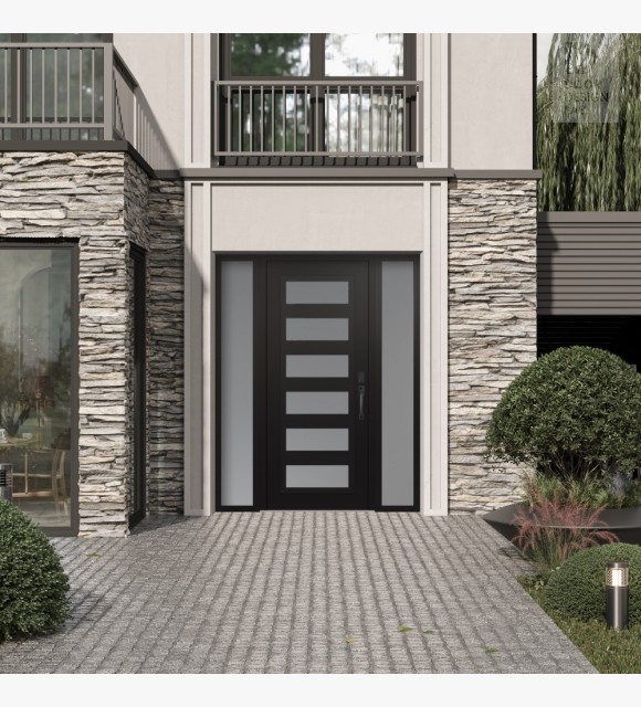Modern Steel Front Door Diamond C9 68" x 80" black/white frosted Glass Panel black LHI with 2 Sidelites frosted Glass