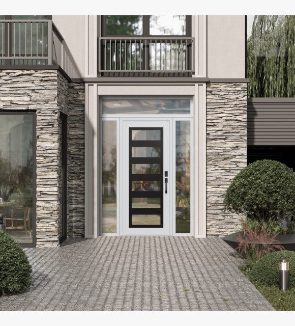 The door unit kit includes a transom and two sidelites, which are decorative stationary sections installed above, to the left and to the right of the exterior door.