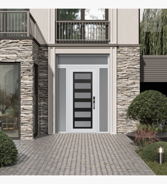 The door unit kit includes a transom and two sidelites, which are decorative stationary sections installed above, to the left and to the right of the exterior door.