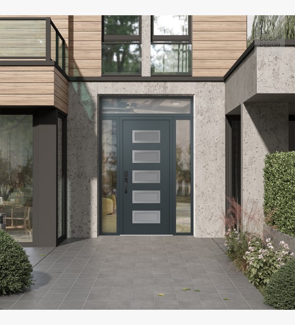 Modern Steel Front Door Diamond D1 64" x 96" anthracite/anthracite frosted Glass Panel stainless steel RHI with 2 Sidelites and Transom clear Glass