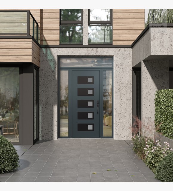 Modern Steel Front Door Diamond D2 64" x 96" anthracite/anthracite frosted Glass Panel black LHI with 2 Sidelites and Transom clear Glass