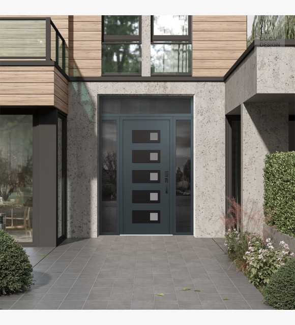 Modern Steel Front Door Diamond D2 64" x 96" anthracite/anthracite frosted Glass Panel black LHI with 2 Sidelites and Transom mirrored Glass