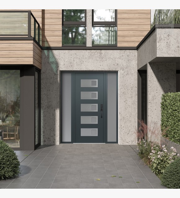 Modern Steel Front Door Diamond D2 68" x 80" anthracite/anthracite frosted Glass Panel stainless steel LHI with 2 Sidelites frosted Glass