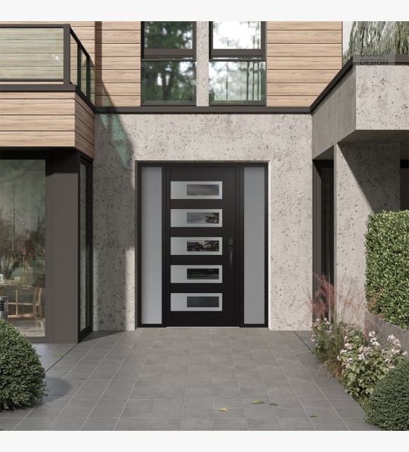 Modern Steel Front Door Diamond D3 64" x 80" black/black mirrored Glass Panel stainless steel LHI with 2 Sidelites frosted Glass