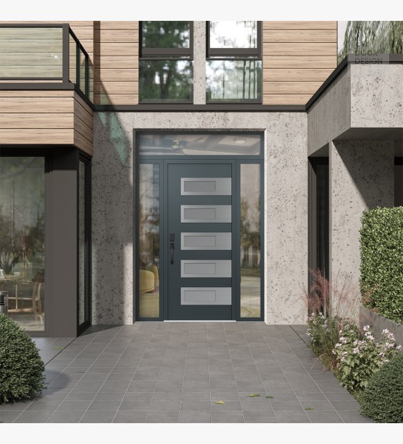 Modern Steel Front Door Diamond D3 64" x 96" anthracite/anthracite frosted Glass Panel stainless steel RHI with 2 Sidelites and Transom clear Glass