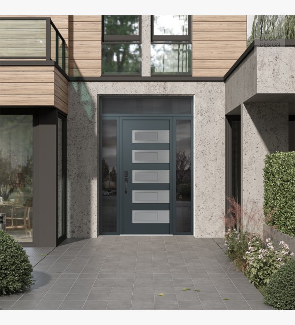 Modern Steel Front Door Diamond D3 64" x 96" anthracite/anthracite frosted Glass Panel stainless steel RHI with 2 Sidelites and Transom mirrored Glass