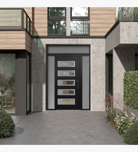 Modern Steel Front Door Diamond D3 64" x 96" black/black clear Glass Panel stainless steel LHI with 2 Sidelites and Transom frosted Glass