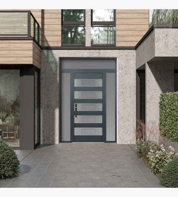 Modern Steel Front Door Diamond D5 64" x 96" anthracite/anthracite frosted Glass Panel stainless steel RHI with 2 Sidelites and Transom frosted Glass
