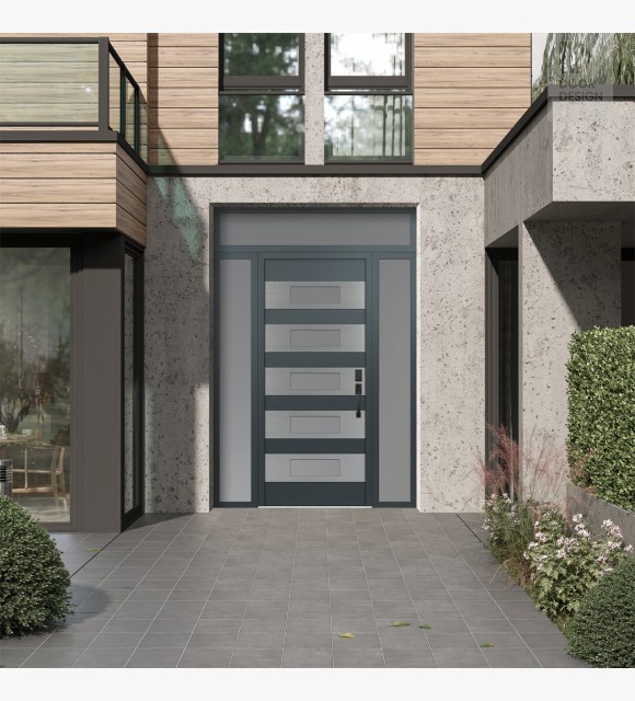 Modern Steel Front Door Diamond D5 68" x 96" anthracite/anthracite frosted Glass Panel stainless steel LHI with 2 Sidelites and Transom frosted Glass