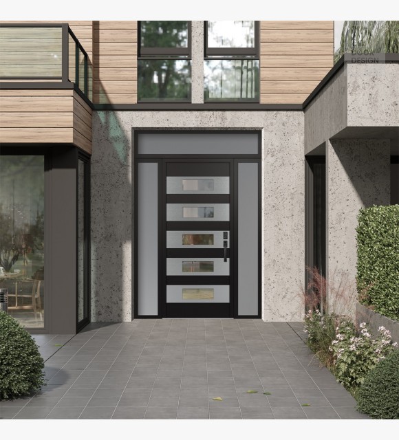 Modern Steel Front Door Diamond D5 68" x 96" black/black clear Glass Panel stainless steel LHI with 2 Sidelites and Transom frosted Glass