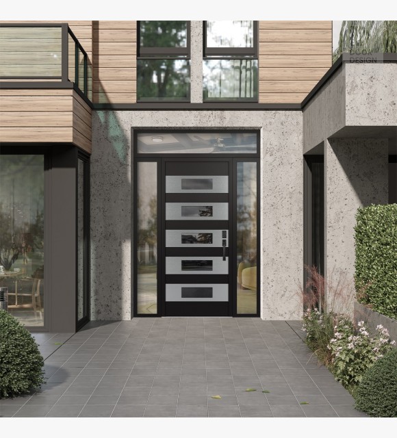 Modern Steel Front Door Diamond D5 68" x 96" black/black mirrored Glass Panel stainless steel LHI with 2 Sidelites and Transom clear Glass
