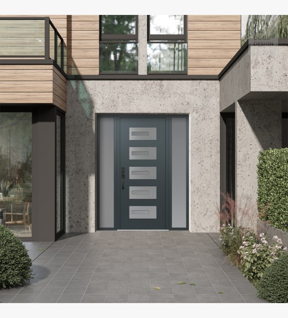 Modern Steel Front Door Diamond D6 64" x 80" anthracite/anthracite frosted Glass Panel stainless steel RHI with 2 Sidelites frosted Glass