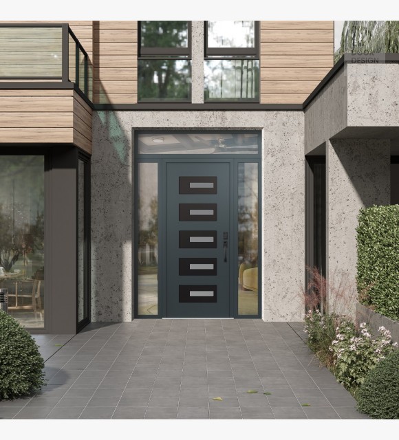 Modern Steel Front Door Diamond D6 64" x 96" anthracite/anthracite frosted Glass Panel black LHI with 2 Sidelites and Transom clear Glass