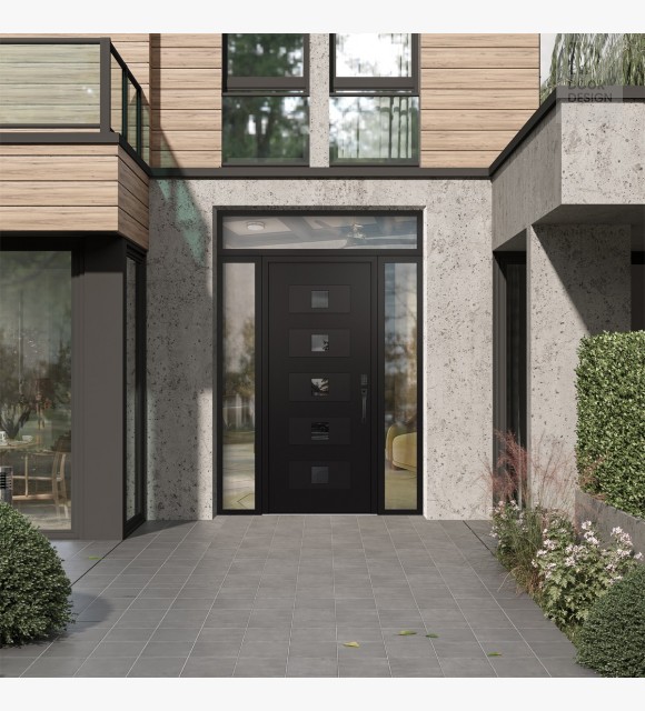 Modern Steel Front Door Diamond D8 64" x 96" black/black mirrored Glass Panel black LHI with 2 Sidelites and Transom clear Glass