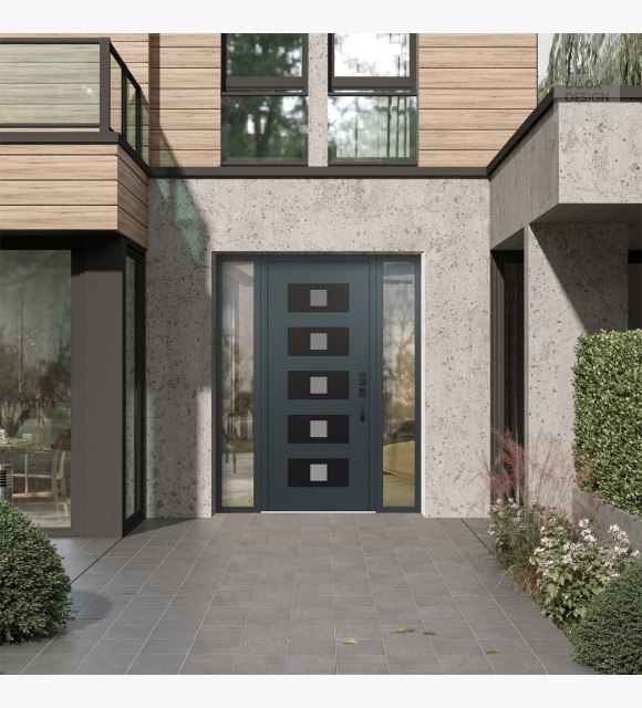 Modern Steel Front Door Diamond D8 68" x 80" anthracite/anthracite frosted Glass Panel black LHI with 2 Sidelites clear Glass