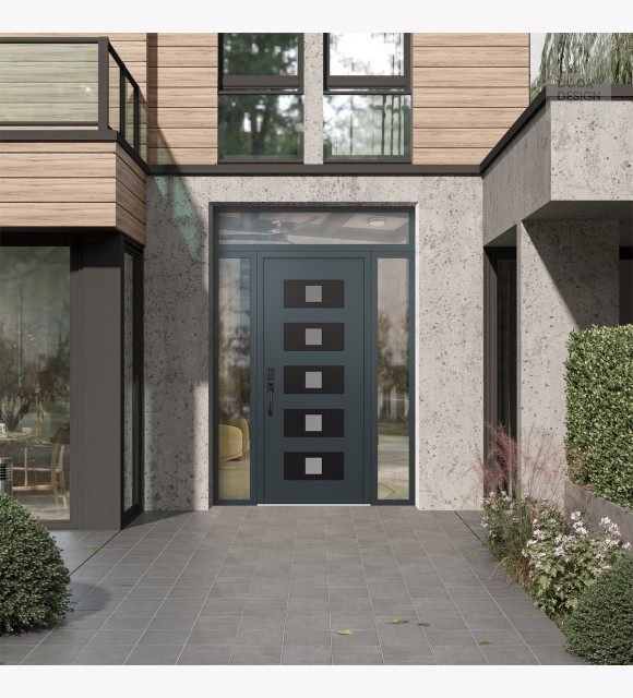 Modern Steel Front Door Diamond D8 68" x 96" anthracite/anthracite frosted Glass Panel black RHI with 2 Sidelites and Transom clear Glass