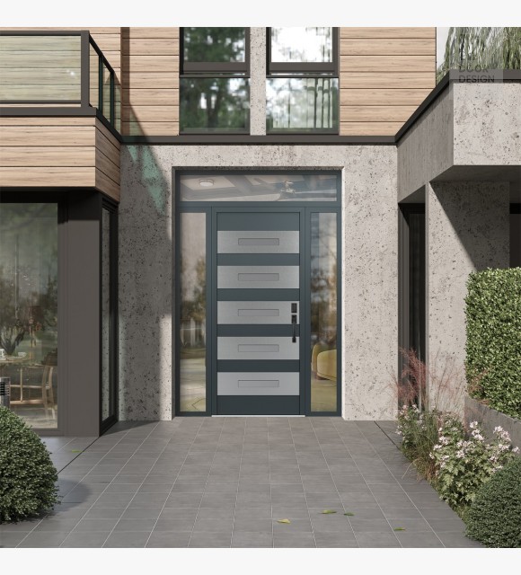 Modern Steel Front Door Diamond D9 64" x 96" anthracite/anthracite frosted Glass Panel stainless steel LHI with 2 Sidelites and Transom clear Glass
