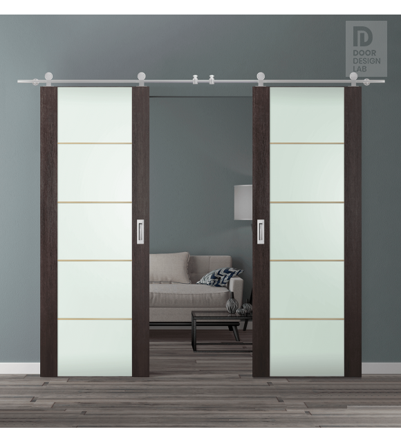 DOUBLE BARN DOOR AVON 202 4H GOLD STRIPS VETRO VERALINGA OAK 36" X 96" X 1 3/4" STAINLESS STEEL HARDWARE