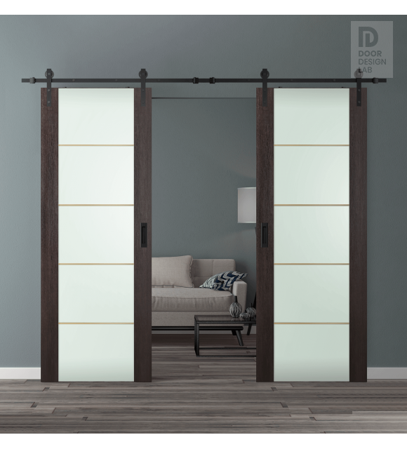DOUBLE BARN DOOR AVON 202 4H GOLD STRIPS VETRO VERALINGA OAK 60" X 84" X 1 3/4" BLACK HARDWARE