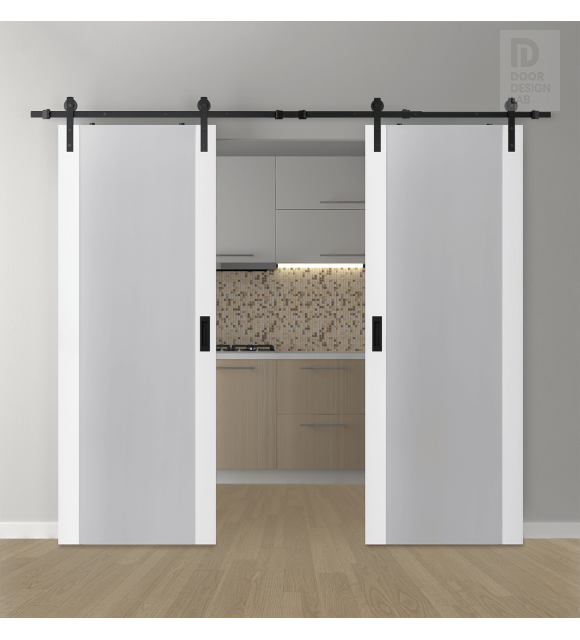 DOUBLE BARN DOOR PALLADIO 202 VETRO BIANCO NOBLE 48" X 84" X 1 9/16" TEMPERED FROSTED GLASS BLACK HARDWARE