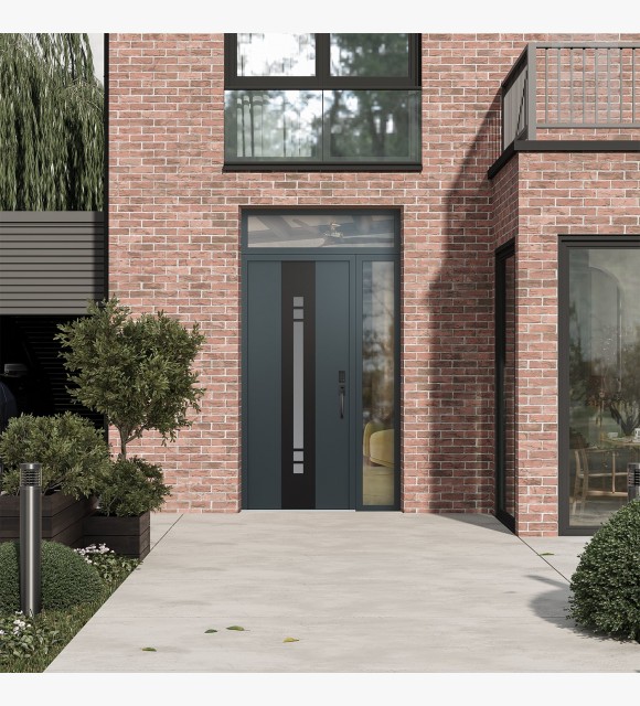 Modern Steel Front Door DIAMOND A4 48" X 96" ANTHRACITE/ANTHRACITE FROSTED GLASS PANEL BLACK LHI WITH SIDELITE AND TRANSOM CLEAR GLASS