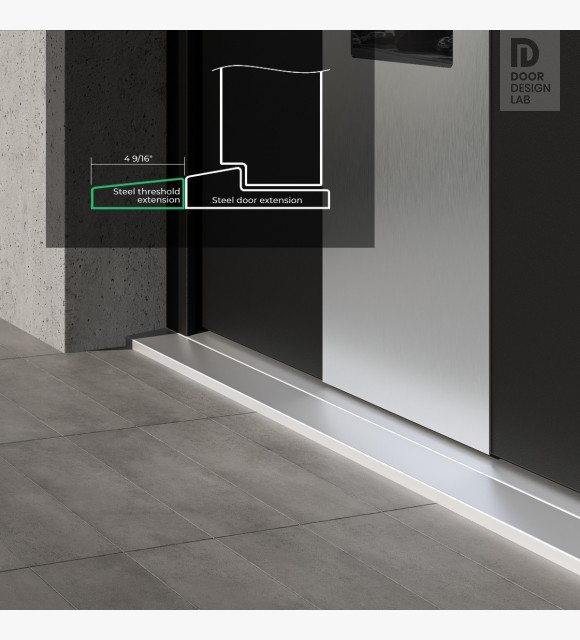 The threshold extension features a galvanized steel frame and a stainless steel cover.